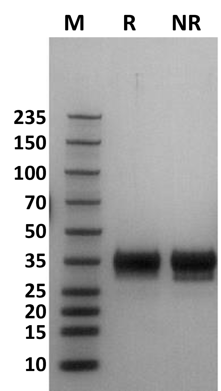 Human Fc gamma RIIb / CD32b on Coomassie Blue stained SDS-PAGE under non-reducing (NR) and reducing (R) conditions. The purity of the protein is greater than 95%.