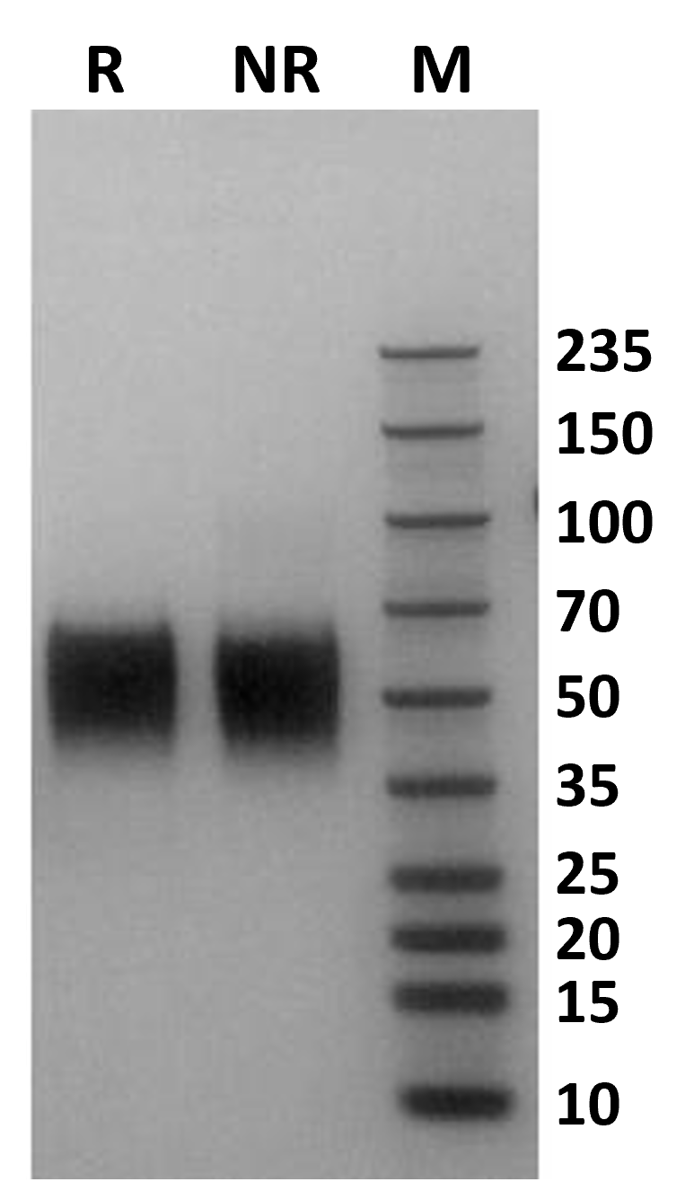 Human Fc gamma RIIIb / CD16b (NA2) on Coomassie Blue stained SDS-PAGE under non-reducing (NR) and reducing (R) conditions. The purity of the protein is greater than 95%.